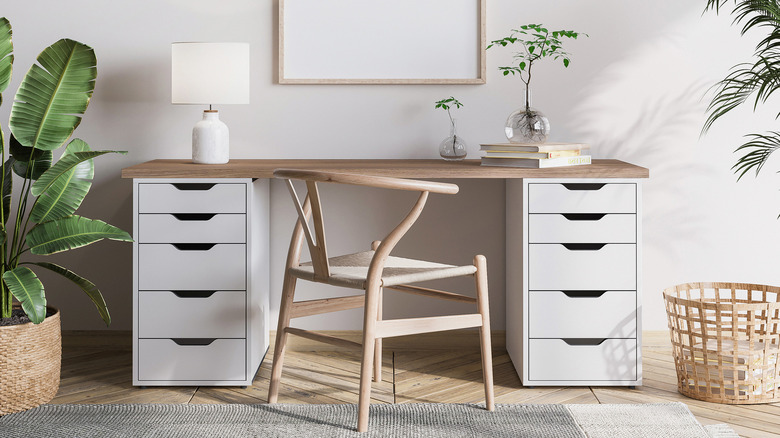 It might seem difficult to find a desk that doesn't take up too much space yet offers a decent amount of drawers, but this option does both. The desk is made from a simple wood slab that has been placed on two shorter cabinets with five drawers.