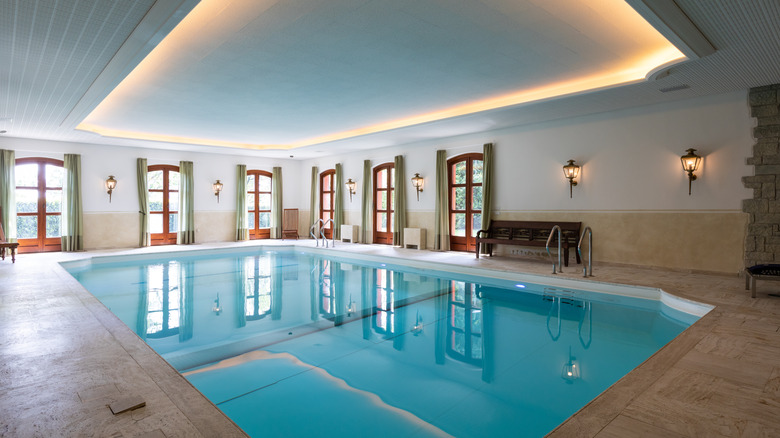 This indoor pool design does an excellent job of allowing light through several avenues: the French doors, sconces, and the glowing ring on the ceiling that reflects against the pool.