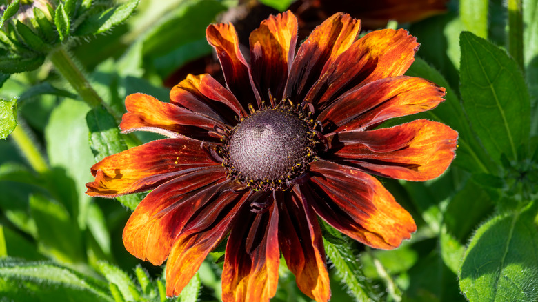 Black-eyed Susans are similar in structure to purple coneflowers, but they each belong to different genera. Laidback Gardener explains that it used to be easy to tell the two apart by color alone. One was yellow (Rudbeckia hirta) and one was pinkish-purple (Echinacea purpurea). Since recent hybrids now come in a rainbow of colors, that distinction is harder to spot. Still, the primary differences between the two lie in their center cones. Rudbeckia cones are darker and soft to the touch, while Echinacea cones are never black and are made up of tiny spikes called paleae. Echinacea is known around the world for its medicinal properties, but black-eyed Susans are only grown for ornamental purposes. In fact, black-eyed Susans are not considered safe to eat, so it's important that you can spot the differences and properly identify your plants. To make things even more confusing, there is a hybrid called × Echibeckia, which brings the two together into one species.