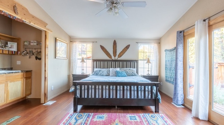 This bright and airy guest suite features a bohemian appeal with Southwestern accents. Per Airbnb, this cozy studio is suitable for two travelers, and though it is definitely on the smaller side, it has plenty of room to get comfortable. The Southwestern rug adds a nice pop of color, complemented by the decorative tapestry on the wall and the throw pillows on the bed. The tall glass windows allow ample natural light to filter inside, and the bohemian decor enhances the charm.