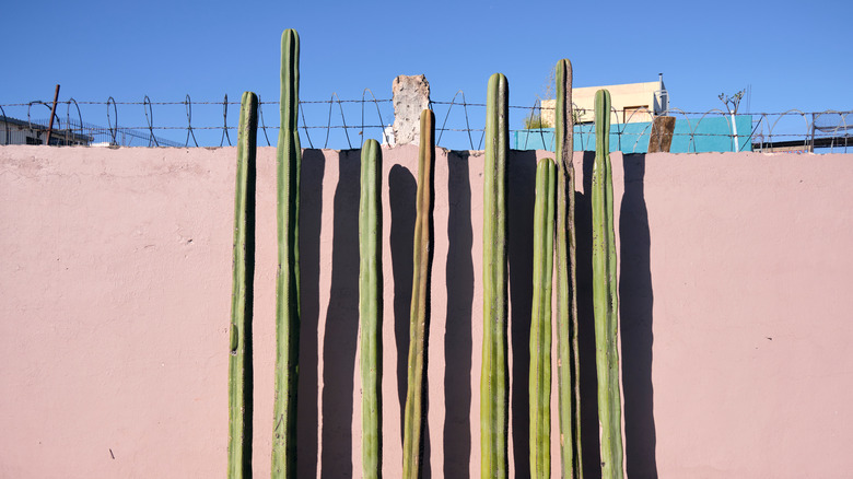 Pachycereus marginatus is a species of cacti that are native to Central America including Oaxaca, San Luis Potosí, and Querétaro, as per Llifle. Known as the Mexican fence post cactus, it is often used as a barrier in hotter climates that support its growth. These stiff plants can grow up to 50 feet tall in the wild, but stay closer to 12 feet when cultivated domestically. Often they split at their base to form two or more branches, all of which grow upright.