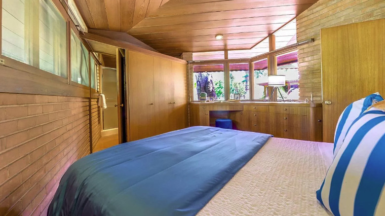 It's hard to resist the gorgeous shared spaces in this Wright-designed California property, such as the various living rooms flooded with light overlooking the terrace area. However, don't worry — there are a few private spaces within the home for the bedrooms. As the Zillow listing photos indicate, the bedrooms feature the same general color palette and mix of materials found in the rest of the home. Some portions of the walls are covered with bricks while others feature wood paneling, and the arched ceilings are likewise blanketed with wood planks, with a few recessed lights adding illumination for the times the natural sunlight isn't quite enough.