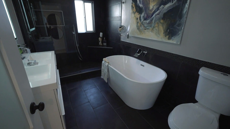 The master bedroom was transformed into a serene space with a natural, earthy setting, including a muted Moroccan-style geometric tile for the fireplace along with light wood like flooring and additional gray, white, and black tones. Although the master doesn't include an ensuite, El Moussa, along with Najia and Junes, design a plan to combine the laundry room and small common bathroom into a complete master oasis. After sealing off an entryway from the kitchen to the former laundry area, the team builds a large master bathroom with congruent black tile on the floor and shower. According to Fireclay Tile, bathrooms that feature black finishes may never go out of style, as they are both a bold and elegant choice. Along with the contrasting white standing tub and dual-sink vanity, El Moussa is on board with how this contrast provides depth and drama to the room.