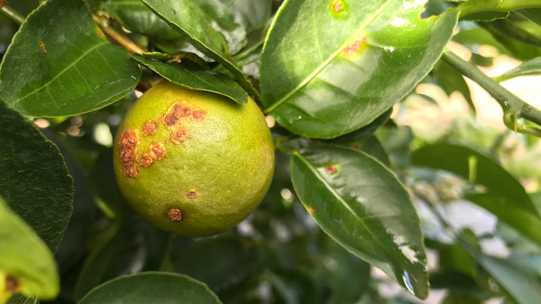 There are some diseases specific to citrus trees that you'll want to work hard to discourage from affecting your Meyer lemons, or else your tree may fail to produce any viable fruit at all. Specifically, these are citrus canker (shown above), lemon or citrus scab, and a persistent virus known as citrus tristeza, per Garden Guides. Few of these issues can be reversed once they've taken hold, so prevention is key. Keep your landscape tidy and keep your trees pruned and free of debris. For new growers, talk to someone at a local nursery about resistant varieties like the Improved Meyer Lemon (Citrus x meyeri 'Improved').