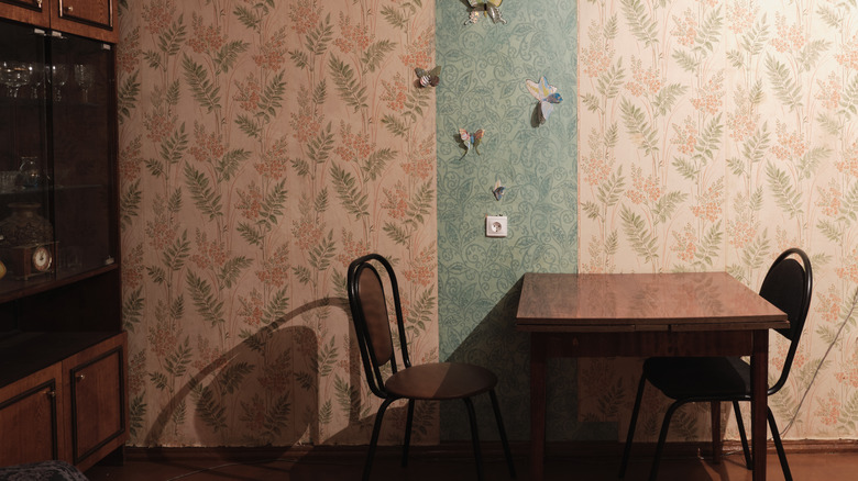 There are many products on the market specifically for removing wallpaper, but some include harsh chemicals or can be expensive to buy, like electric steamers. To remove most types of wallpaper, you really only need a few inexpensive supplies: rubber gloves, a wallpaper scorer, a water bottle, and a putty knife. You will also need something to protect the floor along the wall -– removing wallpaper can get messy. Drop cloths, old towels, or blankets will work. Also, be sure to have a trash can nearby to deposit the old wallpaper.
