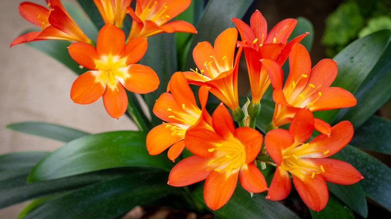 Clivia (also the scientific name) plants were named after Lady Florentina Clive, who was the Duchess of Northumberland and granddaughter of the Clive of India, according to Indiana Public Media. They are indigenous to southern Africa and have showy flowers that appear in clusters. An adult clivia can get up to 2 to 3 feet in height and width; the Chicago Botanic Garden advises buying one that's fully grown because it takes a while to get to this point. They are hardy in USDA zones 9 and 10 and thrive in very rich, well-draining soils.