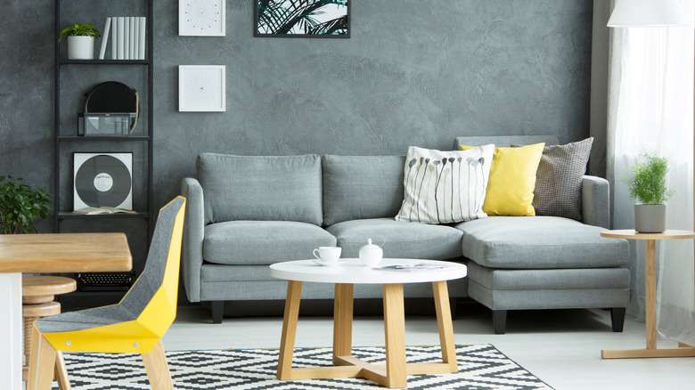 A chaise lounge in a solid color or pretty pattern will instantly draw the eye and create interest in the space. Not to mention a seating arrangement like this gives you a place to chill other than the bed or couch. It's best to utilize it with other furniture, per Studio McGee. Adding layered seating options into the design helps curate a complete look. A chaise lounge is not a one size fits all furniture item, so some personal preference, as well as good measuring, is necessary to ensure the one you love sits in the corner correctly.