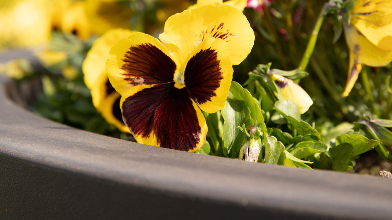 Once you've decided on the colors you'd like, begin by choosing plants with similar requirements for optimal growth. Also, not all blooms last a full season, so it's good to ask questions if you have any concerns about how long your plants will flower. Be careful not to overcrowd your planter by putting too many in the container. The number of plants that can fit comfortably depends on the size of the basket. It's generally fine to place plants every inch for the diameter of the container. Small Space Gardening Basics explains that for a 12-inch pot, it's usually safe to have up to 12 plants.