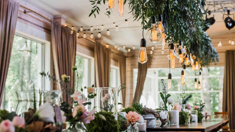 Stringing flower garlands from the ceiling on a wall will create a statement piece that brings the eye up toward the ceiling.