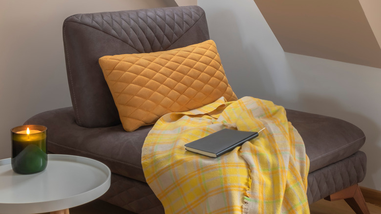 Layering many different cozy materials, like an upholstered cushion, a blanket, and a pillow, will make your space appear cozier.
