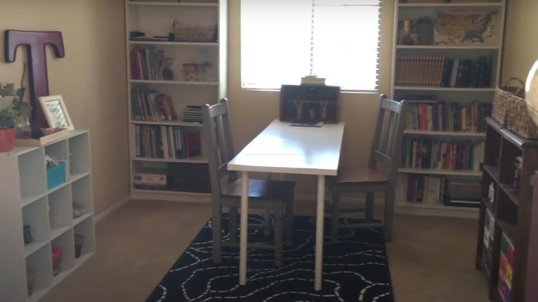 While there's nothing wrong with this home classroom, per se, it's not the perfect setup. As shown in the overflowing cube shelves on the back wall, there's not much space for storage.