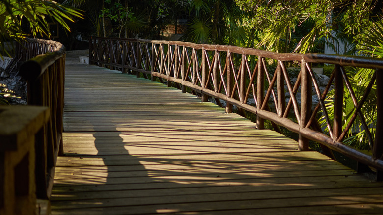 This railing adds a bold touch to the deck due to the thicker wood that's been used. A seemingly sturdy wood in a slightly darker shade certainly helps to define the outside space. However, the railing still has a delicate appearance thanks to the attractive x-shaped design.