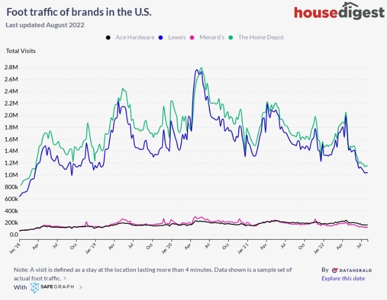 While Ace Hardware has roughly twice as many locations in the U.S. as Home Depot — with over 5,000 storefronts — it receives much less foot traffic than Home Depot or Lowe's (though close to what Menard's gets, hovering around 200,000 visitors per month on average). Why do these two juggernauts pull in so much more, peaking at 2.8 million during the height of the COVID-19 pandemic?