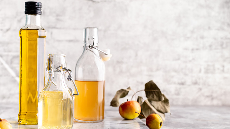 Many homeowners have a bottle of vinegar sitting in their kitchen cabinet right now. The bottle is probably only pulled from the cupboard to make salad dressings, marinades, or other food recipes. However, vinegar has far more uses than just recipes, including household cleaning supplies. Vinegar can be used as a powerful disinfectant because it contains acetic acid, per Healthline. What is acetic acid? It's the colorless organic compound that brings a sour taste and bold smell to vinegar. And because vinegar has an acidic nature, it's often used as a key ingredient in some store-bought household cleaners. Vinegar is strong enough to dissolve dirt, grease, mineral deposits, and grime. It's also powerful enough to kill bacteria. All while also being a naturally derived substance that doesn't contain any harmful chemicals. As many food-enthusiasts may know, there are several different types of vinegars to choose from including white distilled vinegar, apple cider vinegar, balsamic vinegar and red or white wine vinegar. Bonus: Vinegar can also be used to get rid of those pesky mineral deposits from hard water on your toilets and in your shower.