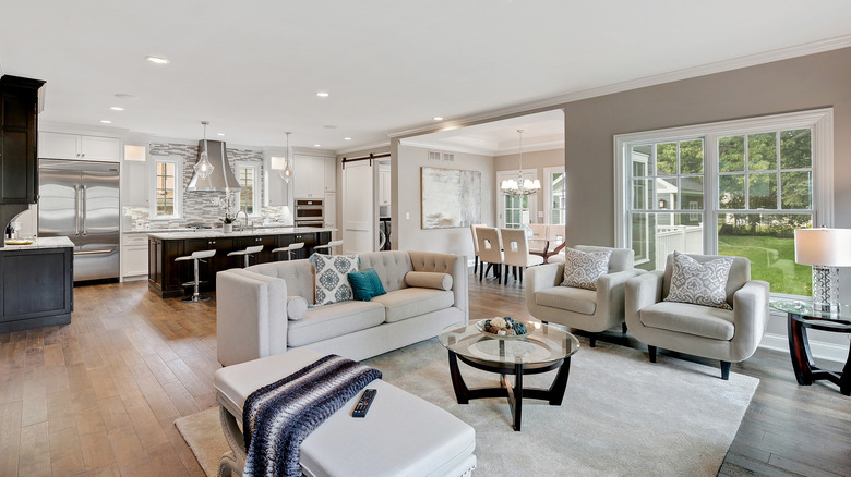 You can also replace coffee tables with ottomans completely and place ornamental decor on them while they aren't being used. Ballard Designs recommends substituting coffee tables with upholstered seating since the latter can be used for both storage and a place to relax when extra bodies are present. You can invest in wooden or metal trays to provide a stable surface for drinks and place them on top of the fabric to protect it. Not only do these look chic and stylish, but they serve a dual purpose making them perfect for entertaining.