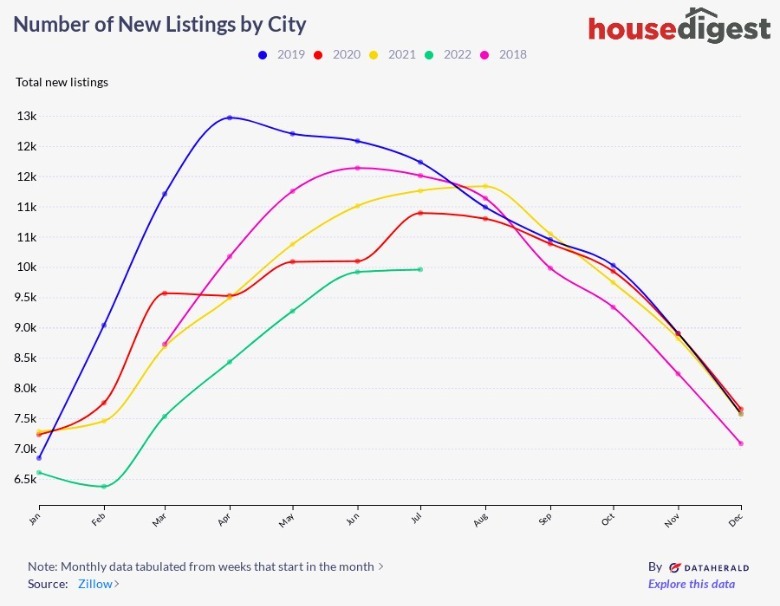 In 2019, the year before the COVID-19 pandemic began, the number of new properties in Atlanta was at its highest at 13,000 in April. By June, there were 12,081 new listings. This predictably dropped in 2020 because of the pandemic, falling to 10,096. And while there was a slight rise in June of 2021 with 11,009 new listings, there was a dramatic decrease this year; June 2022 saw only 9,917 new real estate listings, lower than at the height of the pandemic.