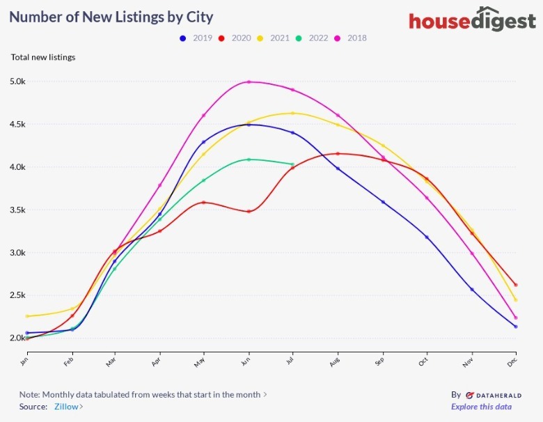 When looking at the above graph created with data from Zillow, it becomes clear that new listings in Portland, Oregon are declining rapidly. In the past five years, the highest the numbers got was in 2018 when they reached 4,989 total in June. Then in 2019, the number reduced slightly to 4,490. Because of the impact that COVID-19 had on the real estate industry, the count plummeted in 2020 to 3,477, then rose again to 4,517 the following year. Now, however, while the number of new real estate listings has not decreased as much as it did in 2020, it is lower than last year at 4,083. According to Rocket Mortgage, this could be because of the increase in people who can work at home from anywhere and the decrease in new builds.