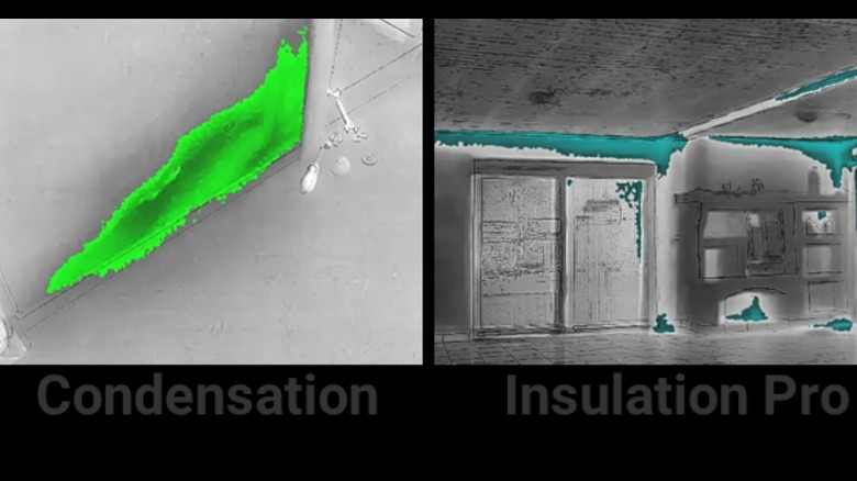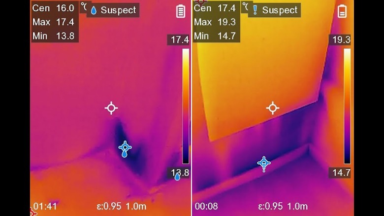 For most everyday purposes — tracking a lost cat, say, or trying to figure out where a drafty window is leaking — HSFTools' 96 series of thermal cameras (presumably named after the 96x96 resolution of their infrared sensors) is perfect. This is where I got started, too, and they're surprisingly good. Take the HP96 rechargeable pocket thermal camera, for example. This thing has a 3.5-inch touchscreen that displays both of the device's cameras (infrared and a 640x480 standard visual camera). The native 96x96 IR resolution is enhanced using HSFTools' "Super Resolution" image enhancement, which does a great job of digitally enlarging thermal images in real time. And the recent addition of the company's IntellFault algorithm takes all the guesswork out of the homeowner's usual reasons for using a thermal camera, like detecting water leaks or gaps in insulation. It manages this by interpreting images using deep learning, an AI approach to spotting problems and patterns a novice might miss. For example, the images below depict suspected water leaks on the left and suspected insulation voids on the right.